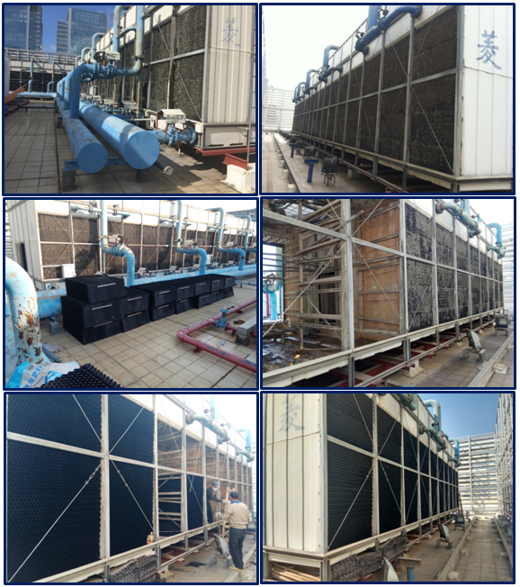 TCL總部大樓采購(gòu)國(guó)內(nèi)知名品牌,冷卻塔總冷量為6000冷噸,原生產(chǎn)廠家已經(jīng)停止生產(chǎn)該款尺寸冷卻塔填料,管道多個(gè)部位均出現(xiàn)破裂漏水,我司排除專業(yè)技術(shù)團(tuán)隊(duì),在不停機(jī)狀況下完成整個(gè)升級(jí)改造,效果于新設(shè)備無異。