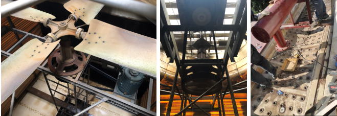 改造前為高轉(zhuǎn)速動力系統(tǒng),噪音大 出風口被擋住,散熱效率差 冷卻塔接水盤破裂