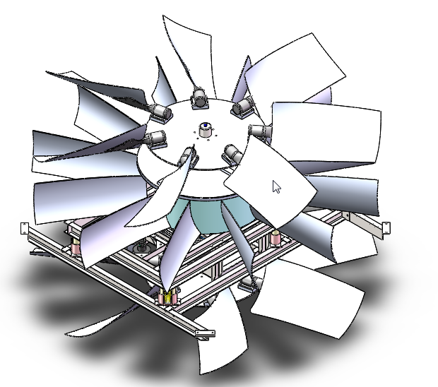 風(fēng)機(jī)設(shè)計為大弦角大風(fēng)量低速型三層風(fēng)機(jī),風(fēng)機(jī)直徑Φ2850mm,葉片數(shù)量7片,轉(zhuǎn)速設(shè)定為100rpm,葉片采用航空鋁合金板材,可進(jìn)行無級調(diào)節(jié)角度。因風(fēng)機(jī)設(shè)計為寬葉葉片,低轉(zhuǎn)速運(yùn)行時具有風(fēng)量大、全壓高、效率高、噪音低、傳動平穩(wěn)等優(yōu)點(diǎn)。而且其氣動性能好、高強(qiáng)度、耐腐蝕,并可通過改變?nèi)~片安放角度方法滿足工藝要求及提高裝置效率。